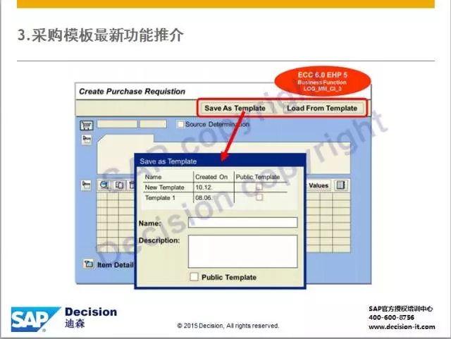 分析:在未启用此功能时,原标准的作法是事先建立一个采购申请或采购订单作为模板,下次使用时通过参考方式创建,但模板凭证容易被报表不正确地统计,需要做特殊标识。