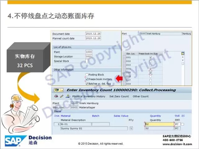 采用冻结账面库存的功能,只需将实际在库(包含未记账的库存)作为盘点结果记录,例如:在盘点凭证中记录实物数量32PCS。