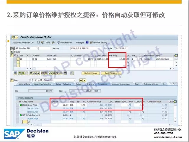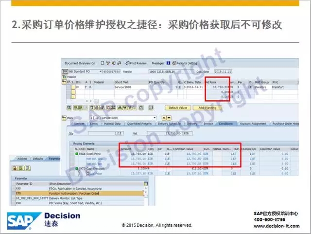 新创建或修改采购订单时,则净价格与条件页签中的内容将处于不可修改状态,这样就达到了我们期望对采购价格的保护。