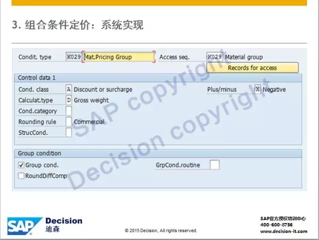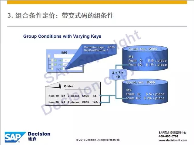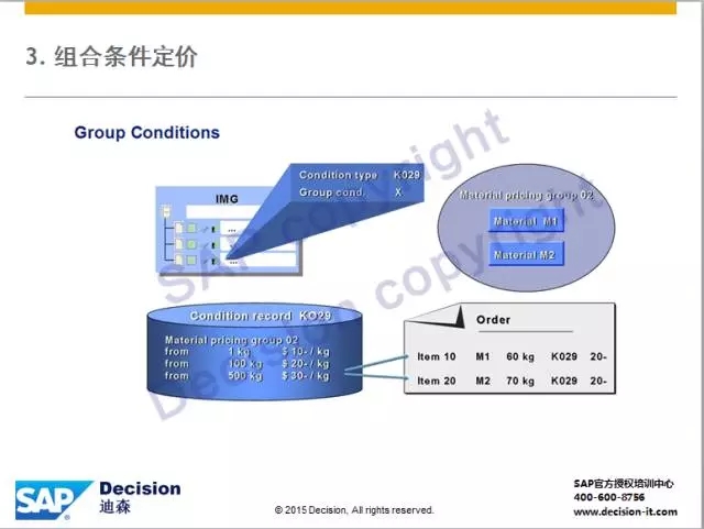 2)条件类型若位于订单行项目,则将符合条件(Varying Keys)的行项目归为一组,比如:若订单中相同物料组下单数量达到阶梯折扣规则,则将这些相同物料组的行项目都计算此条件类型。