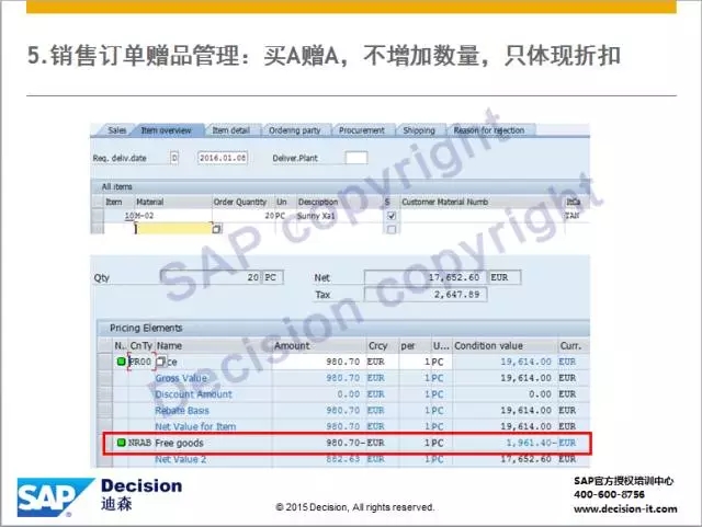 后记:在R3系统中标准赠品只支持1对1关系,若要体现零售中常见的1对多关系,则需要启用 SAP Retail解决方案。