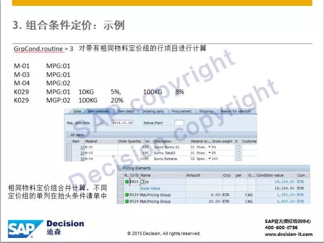比如:订单中存在相同物料定价组的物料总重量超过10KG时享受95折。