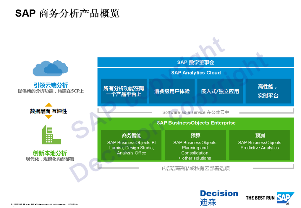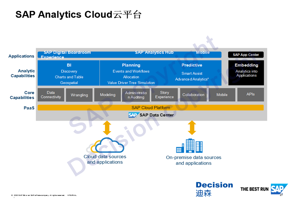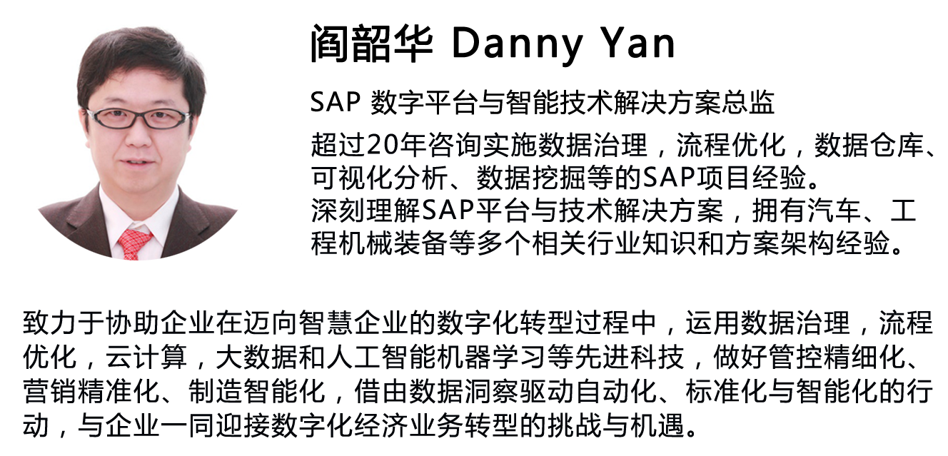 上图可以看出,SAP商务分析这一系列的解决方案当前的情况,下一部分是本地部署的BO、BI、Lumira、Design Studio、Analysis Office等,在预算方面,有非常强大的BPC做财务预算与合并,第三个部分就是预测能力。在上层是基于云的创新,它是基于SAP Cloud Platform上构建起来的一个对分析、计划、预算、预测去做一个实时创新的平台,它定位在工厂高层以及集团层面做一些实时的展示。