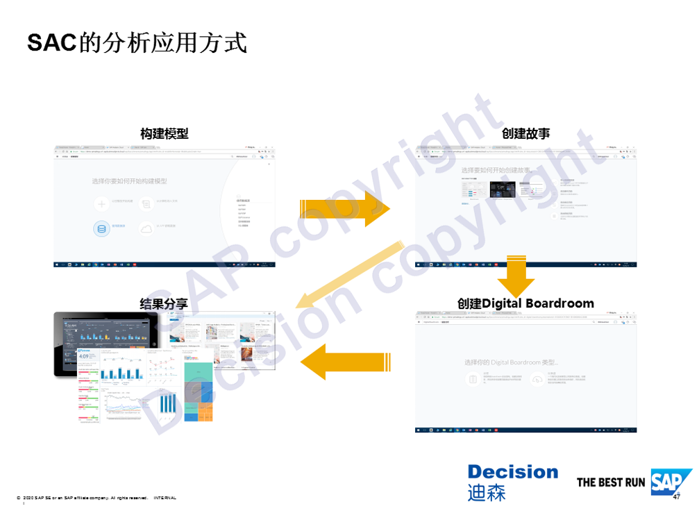 SAC的分析应用方式为:创建模型-创建故事-创建Digital Boardroom-结果分享。首先是构建模型,我们可以通过数据卡片视图或者是网格视图去分析我们获取的数据结构和数据质量,数据准备好以后,就支持业务人员去敏捷的创建可视化的分析故事和个性化的仪表盘,在一体化的平台上,可以提供更全面的分析体验,支持用户在查看图表和数据的同时,能快速、便捷的进行更深入的分析。在数据故事当中,我们还可以添加地图或绘制图形,然后基于创建的Story,通过直观、拖放方式创建一个响应迅速、流畅的 Boardroom,最后形成结果分享。