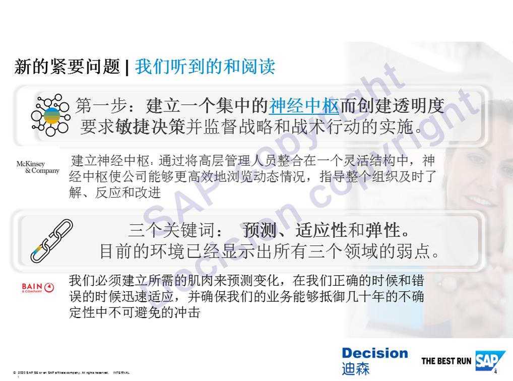 麦肯锡在三月报告中指出,企业的商业领袖目前面临一个复杂的环境,人、财、物的挑战,我们需要建立一个集中的神经中枢,创建全集团的透明度来提高敏捷的决策,形成一些战略战术的小组,把这些不同角色、不同部门甚至是不同参与者集中在一起进行战术决策。
