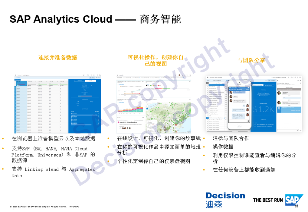 在商务智能方面,SAC可以连接并准备数据,采用浏览器的方式,去访问云端或本地数据,它能支持SAP和非SAP的数据源,同时它也提供可视化的操作界面,不需要安装客户端,可以实现在线设计,采用一种故事线的模式去构建分析的场景,监控,深入探查和根本原因分析。而且非常容易与团队进行互动式的操作,可以利用权限控制谁能查看与编辑你的分析,在任何设备上都能收到通知。