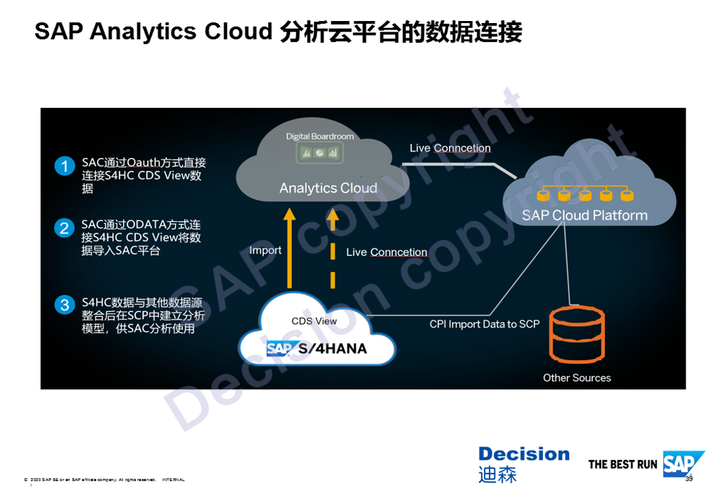 对于ERP、S/4、ECC或者是云端的S/4HANA Cloud都可以采用直连或者数据上传的方式,通过默认的一些CDS View直接去消费,我们去打开一些通讯区域就可以直接连接。SAC提供了数据连接的一个完善的数据准备,数据治理和连接控制的功能,同时,我们可以以手动或计划的方式去进行数据刷新。