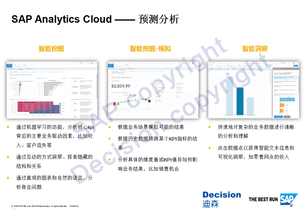 在预测分析方面,它内置了一些机器学习的功能,可以分析核心KPI背后的主要业务驱动因素,可以根据业务场景模拟可能的结果,通过机器学习的方式,提供一个智能判断,然后再去后端进行洞察和模拟。