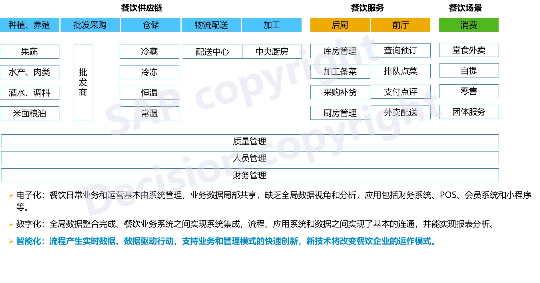 餐饮企业如何正确实现数字化转型?需建立以客户为中心的服务理念,用数据驱动企业的智慧大脑,同时也需要建立无边界的智慧供应链网络,打造餐饮价值链端到端的业务与财务一体化,才能成就智慧餐饮企业。