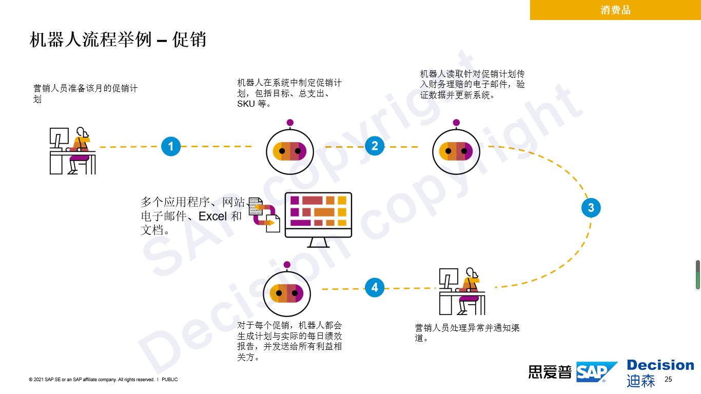 以消费品行业促销流程为例,营销人员准备该月的促销计划,可以通过多个机器人协同完成这项促销任务。只需将促销计划作为信息的输入源提供给机器人,机器人就可以自动的、系统地帮助企业维护该月的促销计划,对财务理赔电子邮件,验证数据并更新系统之后,通知营销人员进行异常的处理和调整。在每个促销完成之后,机器人会对整个全渠道的信息进行提取整合,并发送给相关营销人员,人工只需去做更有价值的上层策略性分析即可。