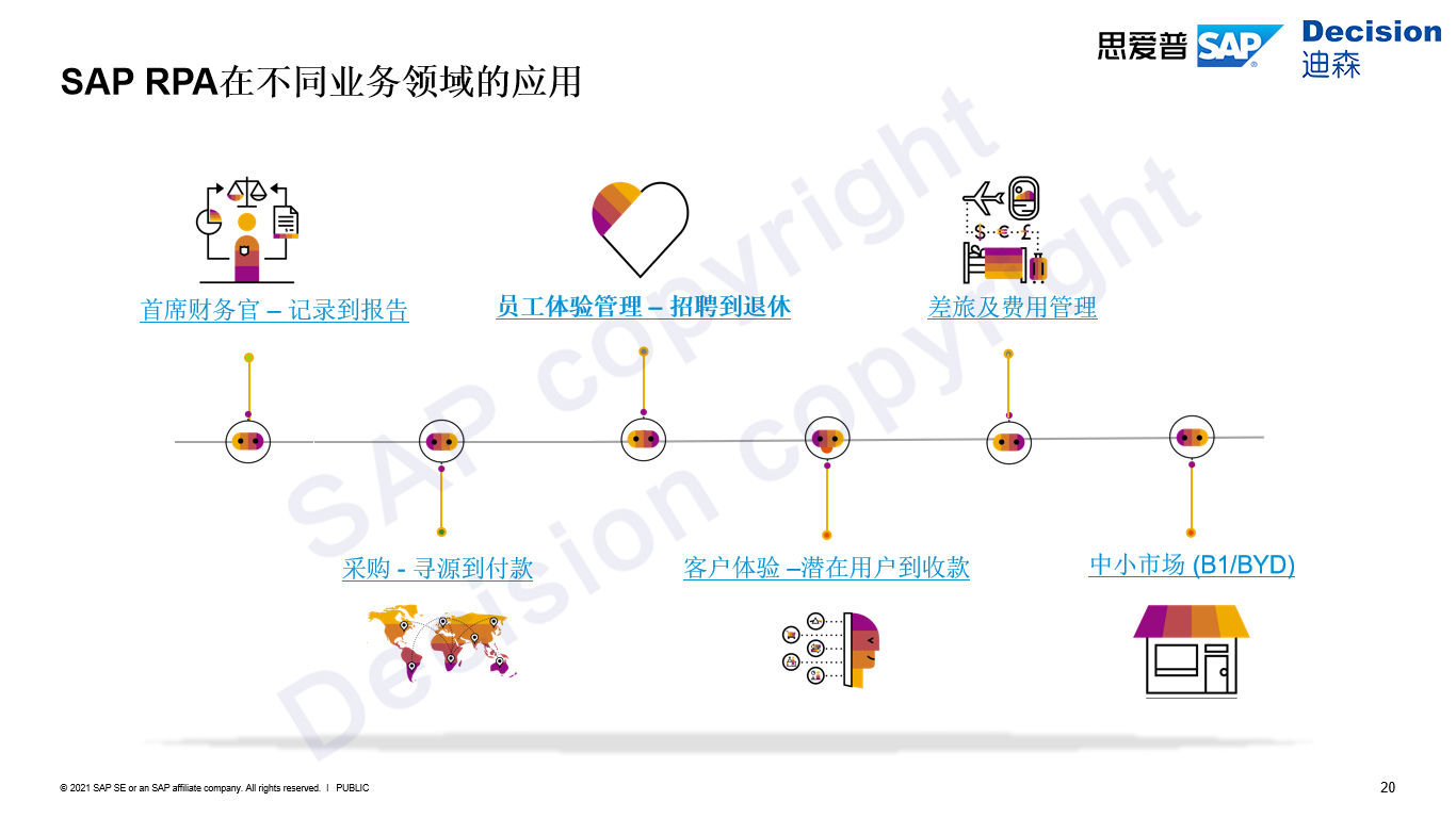 目前SAP iRPA的应用场景已覆盖到了方方面面,最典型的业务场景是财务领域,包含记录到报告的业务条线,除财务之外,如上图所示,采购,从寻源到付款,员工体验管理,从招聘到退休,客户体验从潜在用户到收款,差旅及费用管理,以及针对中小市场的一些工具,如B1和BYD都有很好的一个支持。