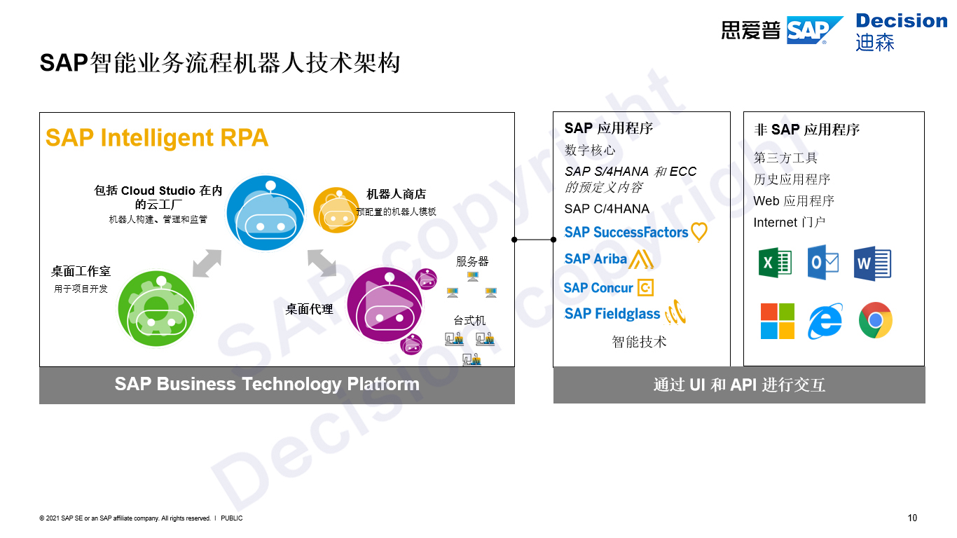 第四点介绍过SAP智能业务流程机器人由三个核心组件构成,通过上图右方框架中可以看到RPA本身的一个架构情况,简单来说是作为工具进行自动化处理的一些业务流程,通过UI和API与企业目标程序进行交互,例如SAP的应用程序S/4HANA、C/4HANA等,非SAP应用程序第三方工具、Internet等。对于微软办公应用软件,通过集成SDK到RPA中,调用SDK即可进行操作,无需UI捕获。