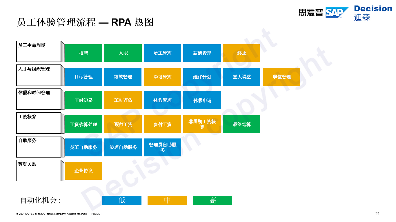 员工体验管理这个端到端的业务流程中,如何通过RPA进行自动化处理,蓝色模板表示不适用SAP来进行处理,黄色模块表示在RPA中有探索的空间,绿色模块说明非常适用于RPA进行处理。例如在招聘领域,简历发放及候选人背景调查,SAP RPA可以帮助简化整个招聘流程。
