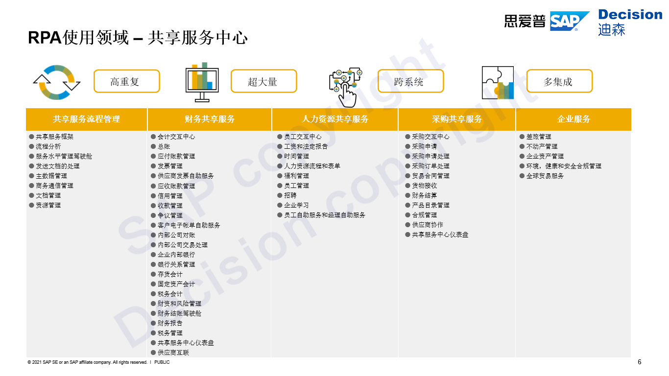 如上图所示,我们可以看到无论是共享服务流程管理、还是财务共享中心、人力资源共享服务等,由于这些领域的数据量较大,就需要清晰的处理事务的逻辑,而SAP iRPA拥有非常多适用于这些领域的场景,我们可以高度概括为四个关键词: