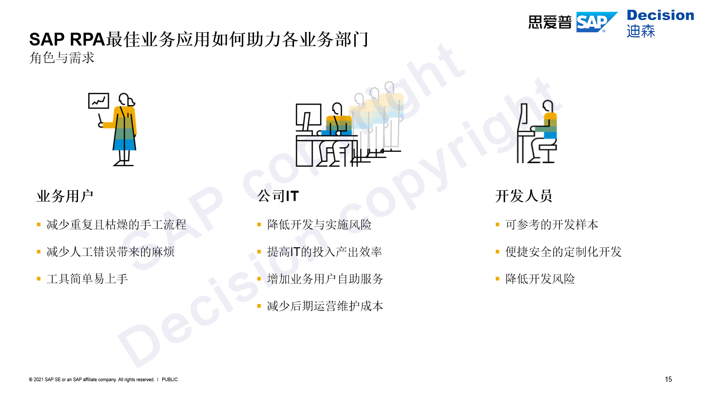 通过SAP机器人商店预定义的RPA模板,SAP iRPA业务应用如何助力企业降本增效,通过上图所示,主要分为三大角色与需求: