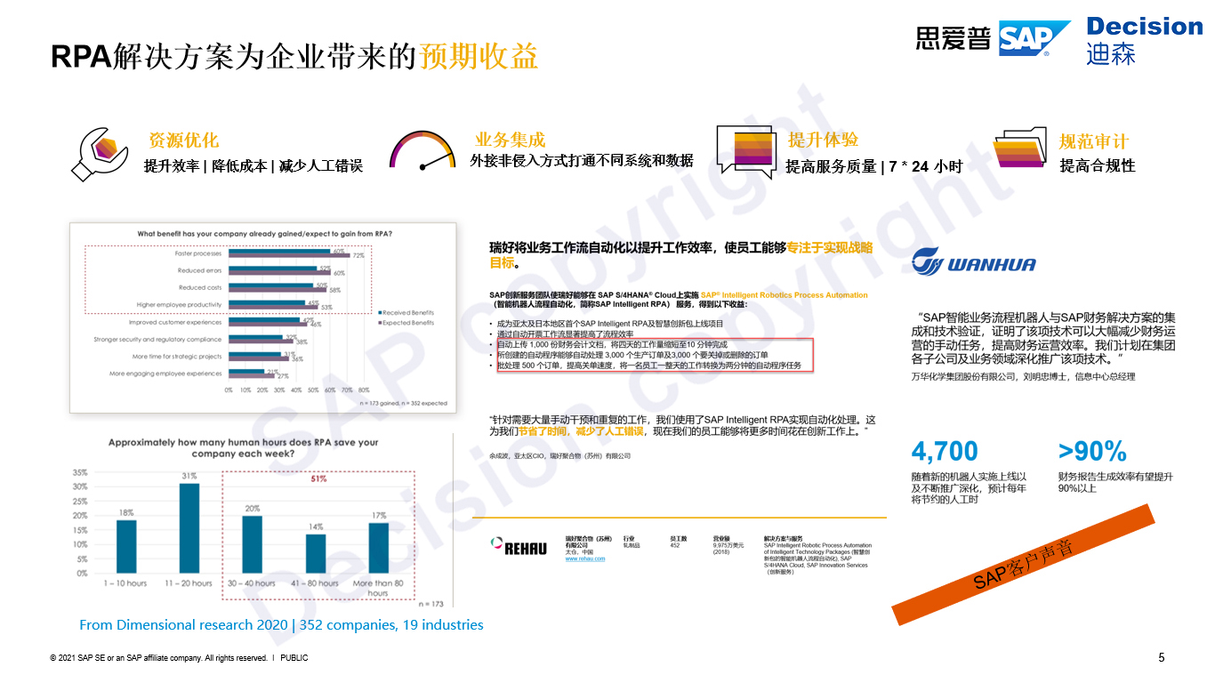 以SAP服务客户万华化学为例,希望通过SAP智能业务流程机器人帮助企业自动化生成及整合财务报表,从而提升整个财务的运营效率。在交付过程中,首先帮助可优化了业务流程,将原来需要手动生成财务报表的12个步骤减少至2个步骤,只需启动机器人,就可让机器人自动执行。通过交付的5个RPA机器人可帮助万华化学每年预计节约4000小时以上的工时,同时机器人可以比人工操作效率平均提升50%以上。