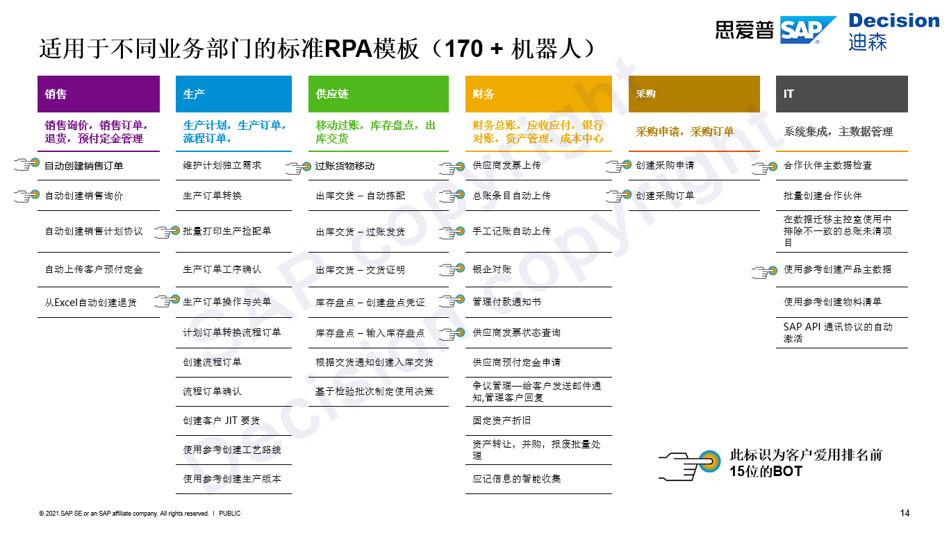 预定义RPA模板已成功上架了超过170个不同的业务流程机器人,不断完善和丰富预定义的RPA,如上图可看到覆盖了多个业务线,包括销售、生产、供应链、财务等,根据客户的使用率来统计,这些都是非常典型的RPA场景。