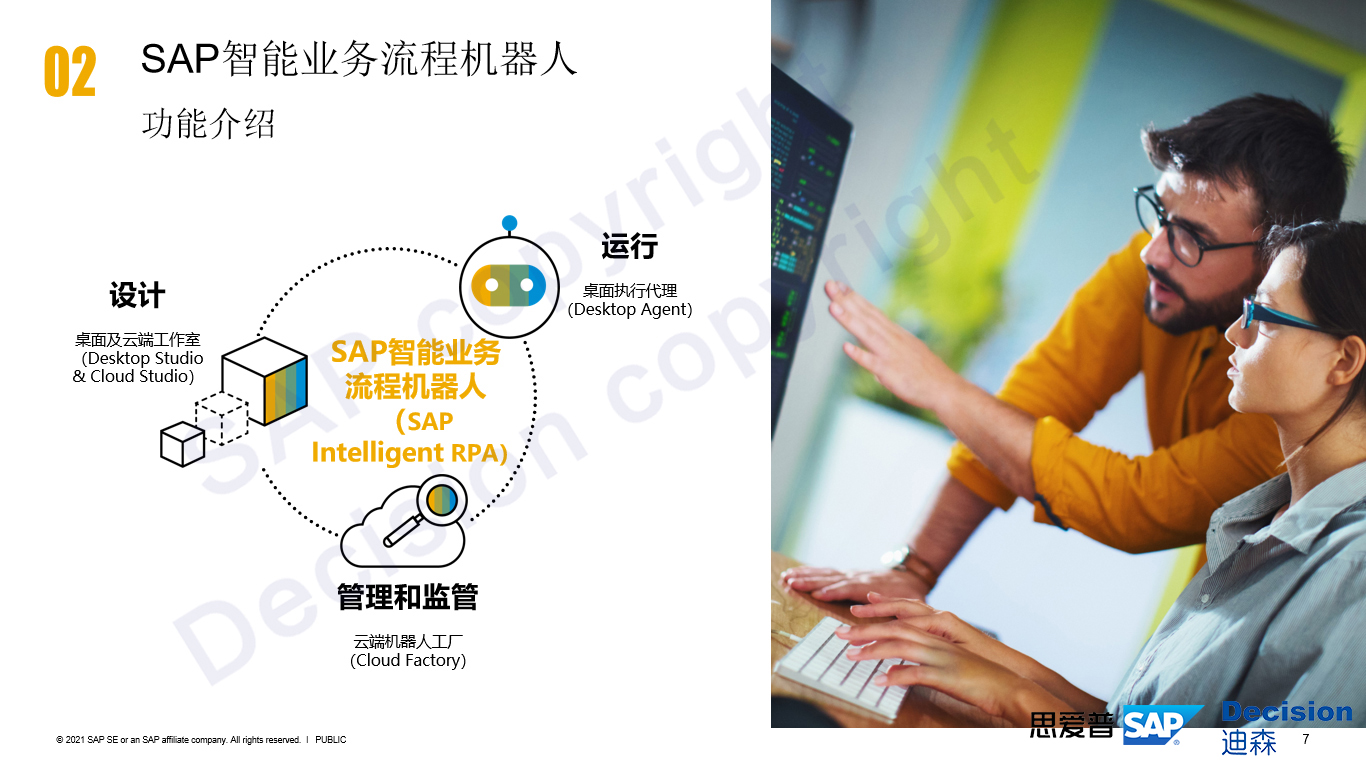 ■ 管理和监督:对机器人执行过程中进行中央化的管理和监督,称为云端机器人工厂,这是托管于SAP平台的一款SaaS应用。