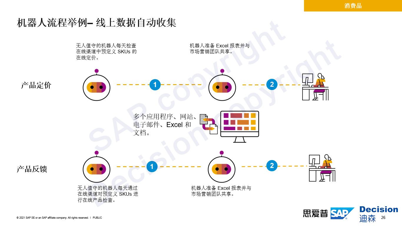 同样以消费品行业线上数据自动收集流程为例,由于线上消费越来越多,消费品行业产品的定价和反馈数据大多数从线上抽取。数据量大,让人工进行抽取非常耗时,企业可以通过无人值守机器人,每天检查线上渠道中的SQ定价,并且抽取定价填入相关表格,再通过邮件或短信的方式发给相关人员做后续处理。总而言之,RPA的特点也涵盖大规模数据的整合提取,通过RPA跨平台,柔性串联数据进行自动化处理。