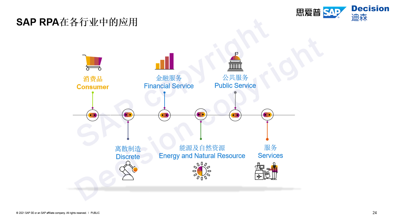SAP iRPA除了在不同业务领域中的应用场景之外,在各行业中也有很多适用的应用场景。消费品、金融服务、公共服务、离散制造、能源及自然资源、服务等方面都有不少典型应用。