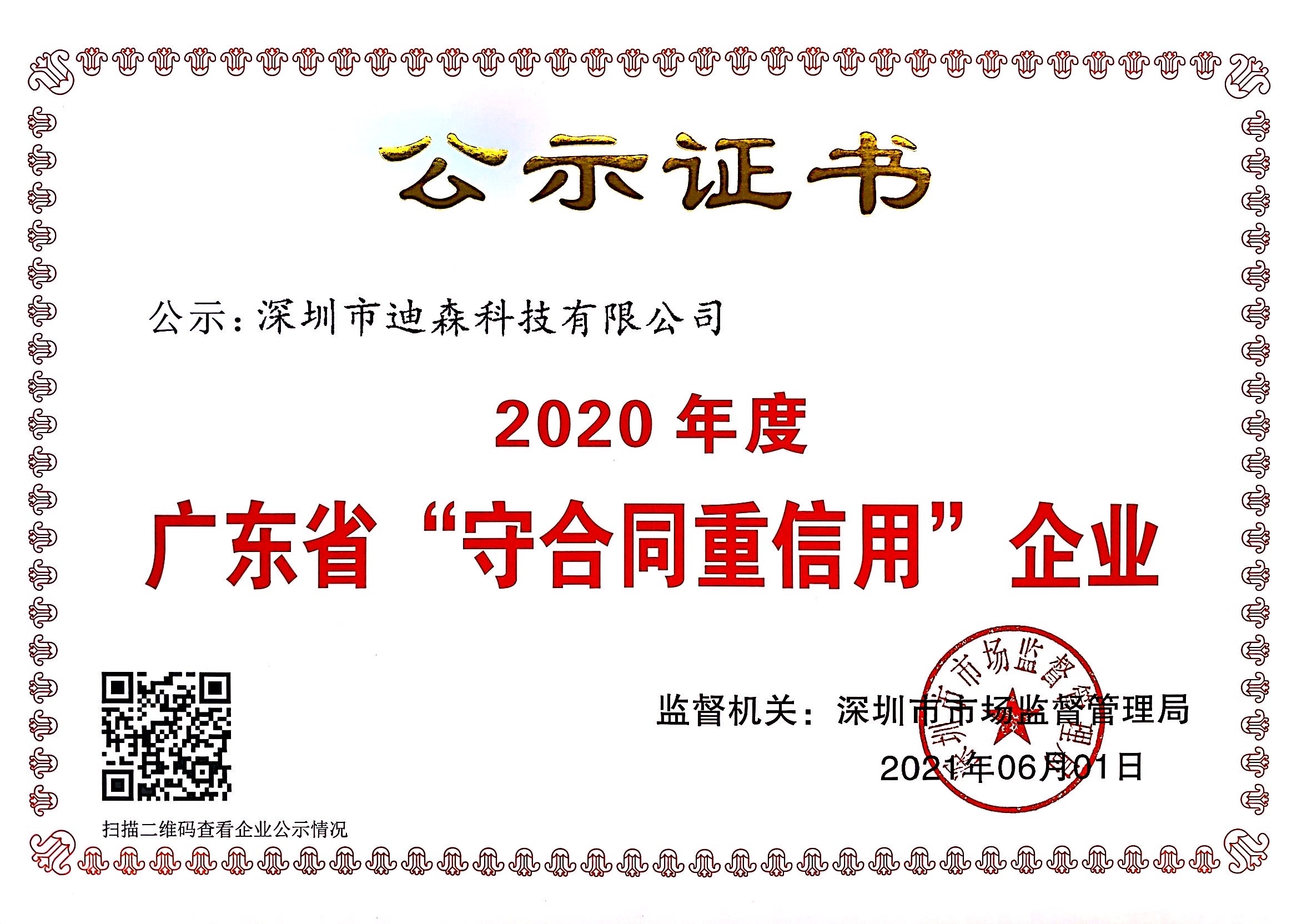 次 2021年6月1日,深圳市市场监督管理局对2020年度“广东省守合同重信用”企业进行公示,迪森凭借良好的信用体系建设以及诚信守约的企业形象,被授予“广东省守合同重信用企业”荣誉称号。