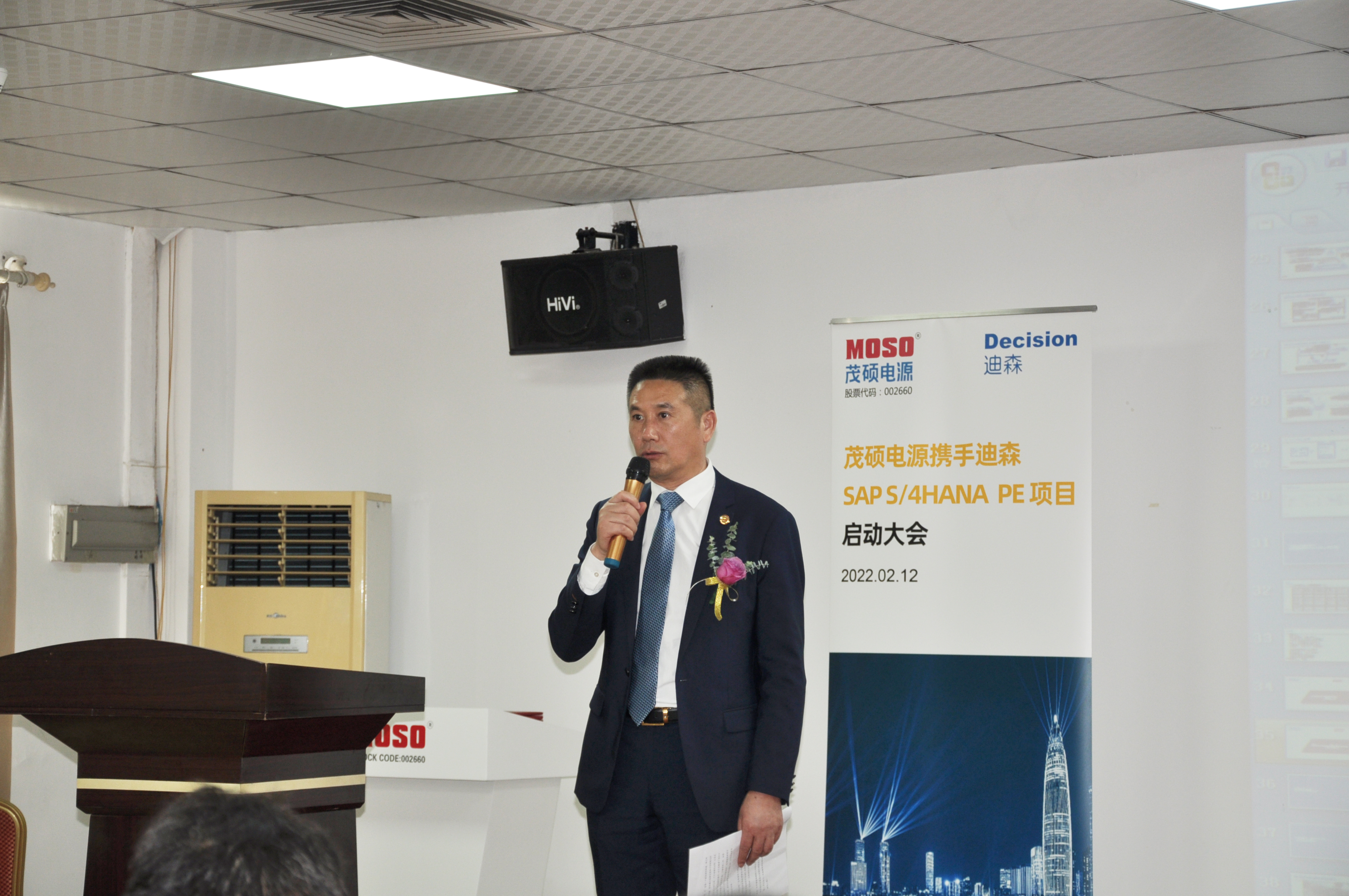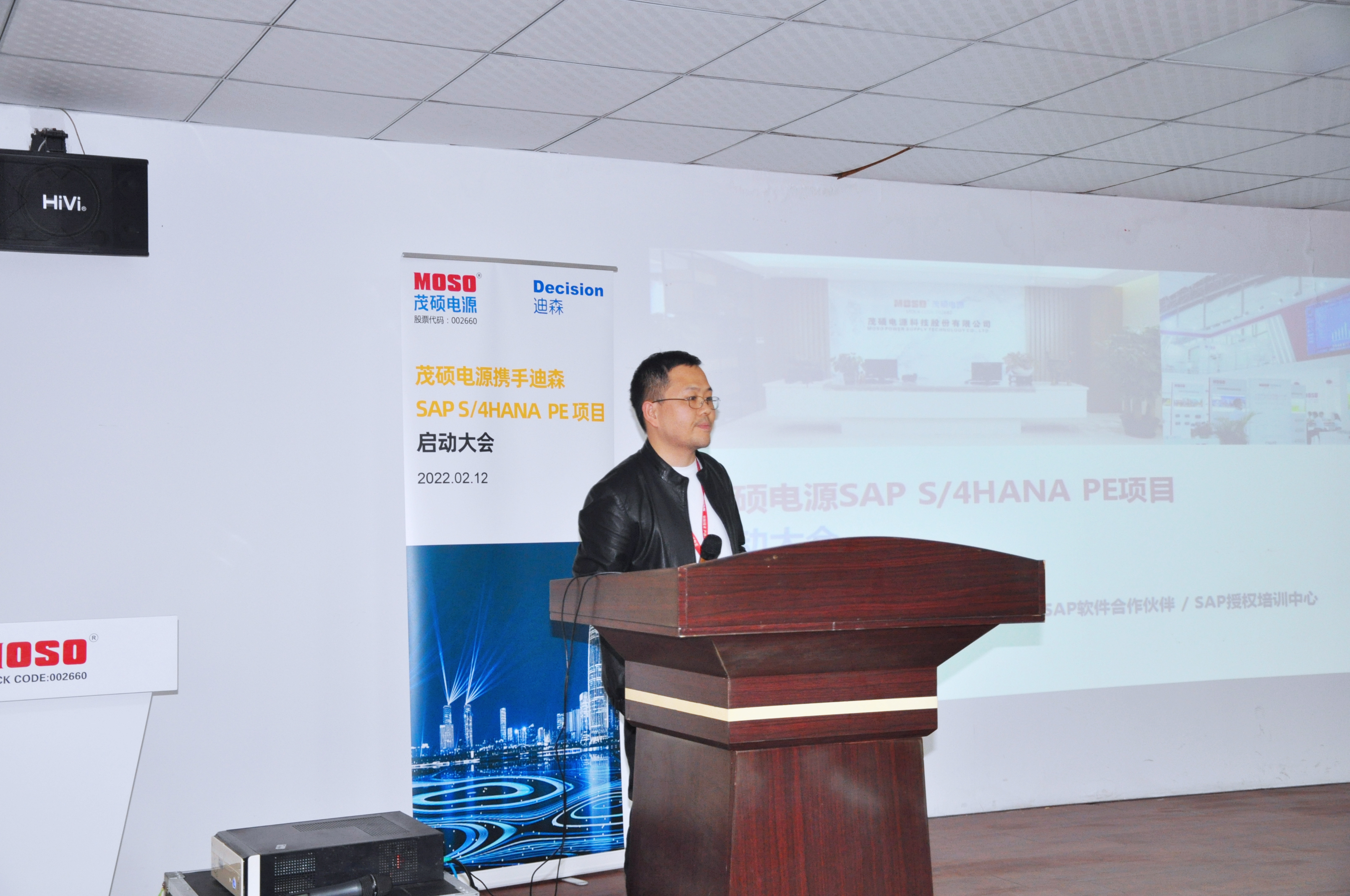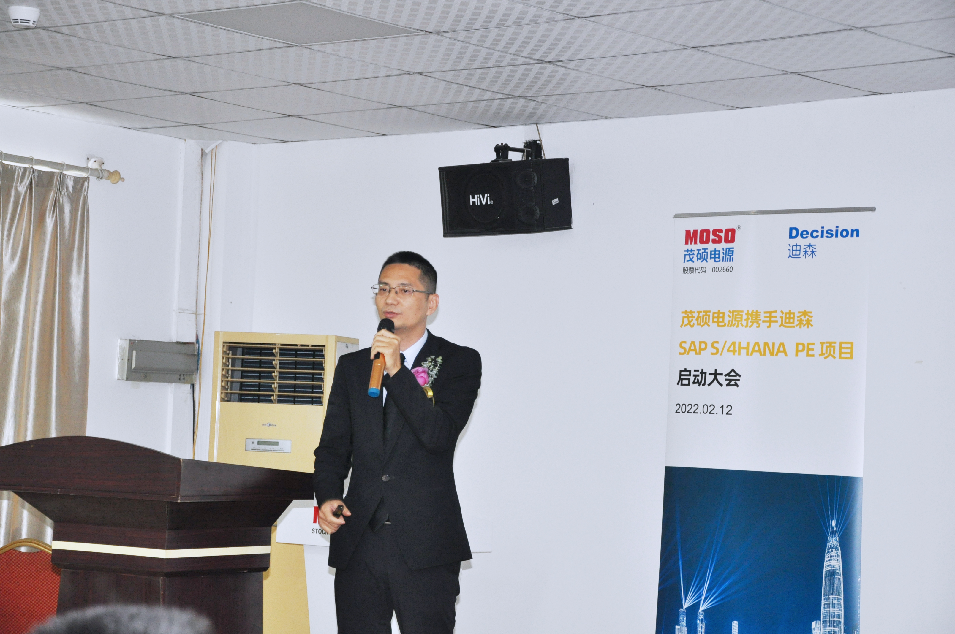 茂硕电源创始人顾先生表达了实施此次项目的重要性,他讲到:“茂硕有着成为全球电源第一品牌的初心与使命,选择SAP进行升级管理是企业数智化转型的必经之路,茂硕需要借助数字化工具进行智慧转型,我相信大家通过本次项目定能成为茂硕的精英骨干,同时我也非常感谢迪森能与茂硕合作,希望各部分负责人、项目关键用户齐心协力,在迪森资深的顾问团队保驾护航下,本次项目定能成功上线。”
