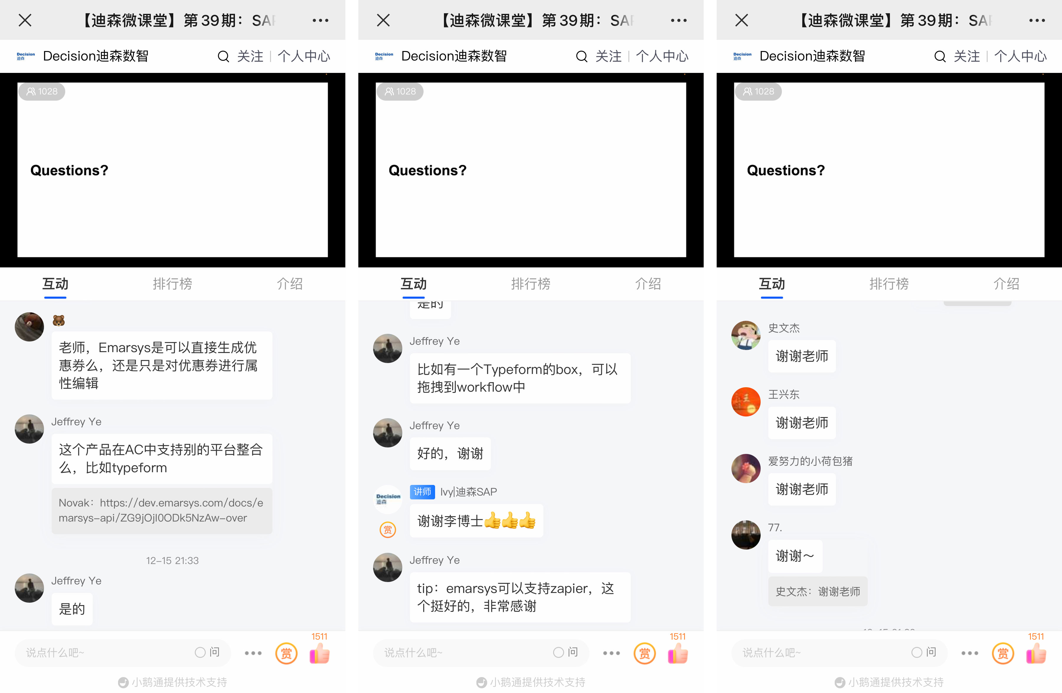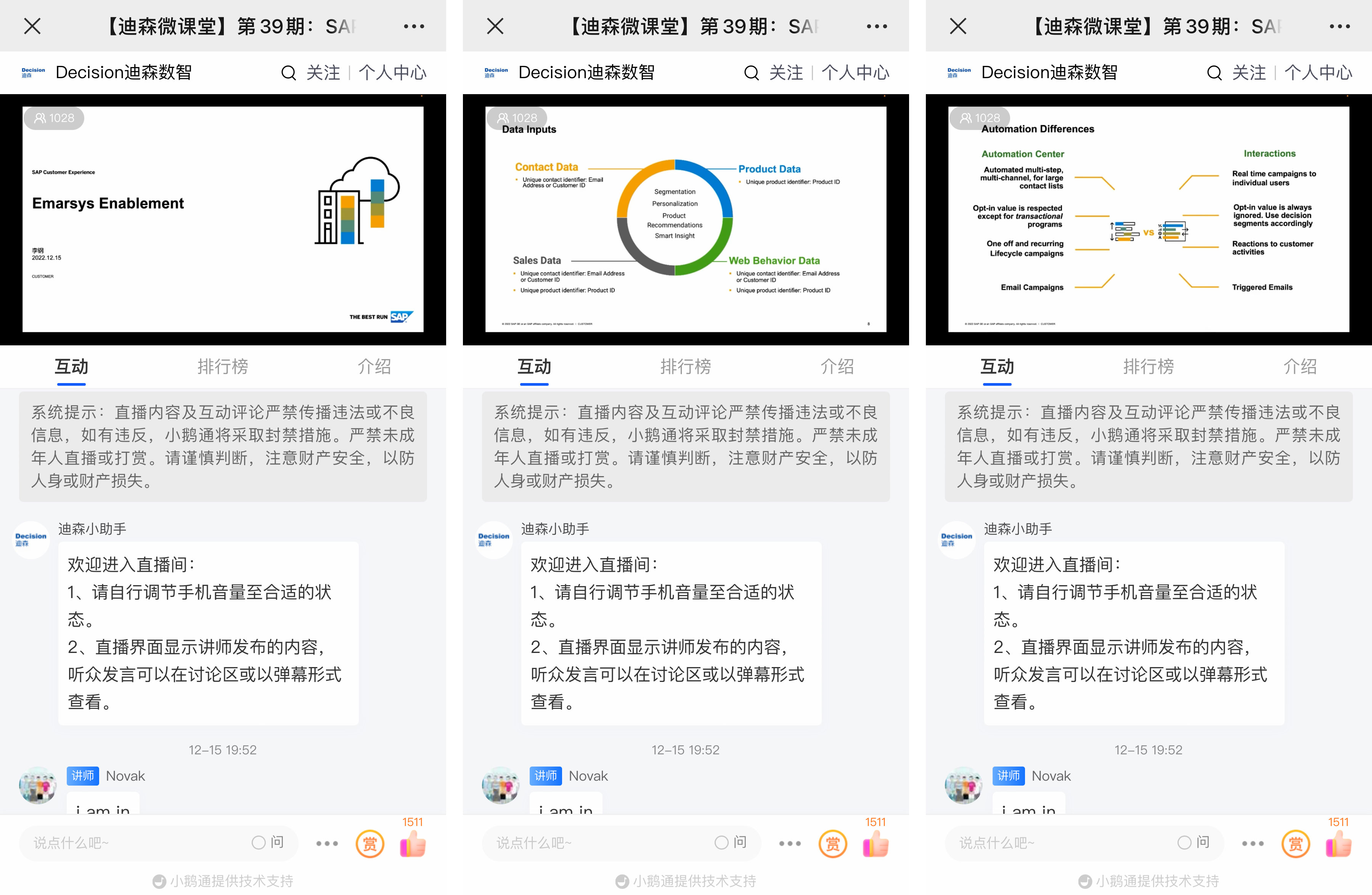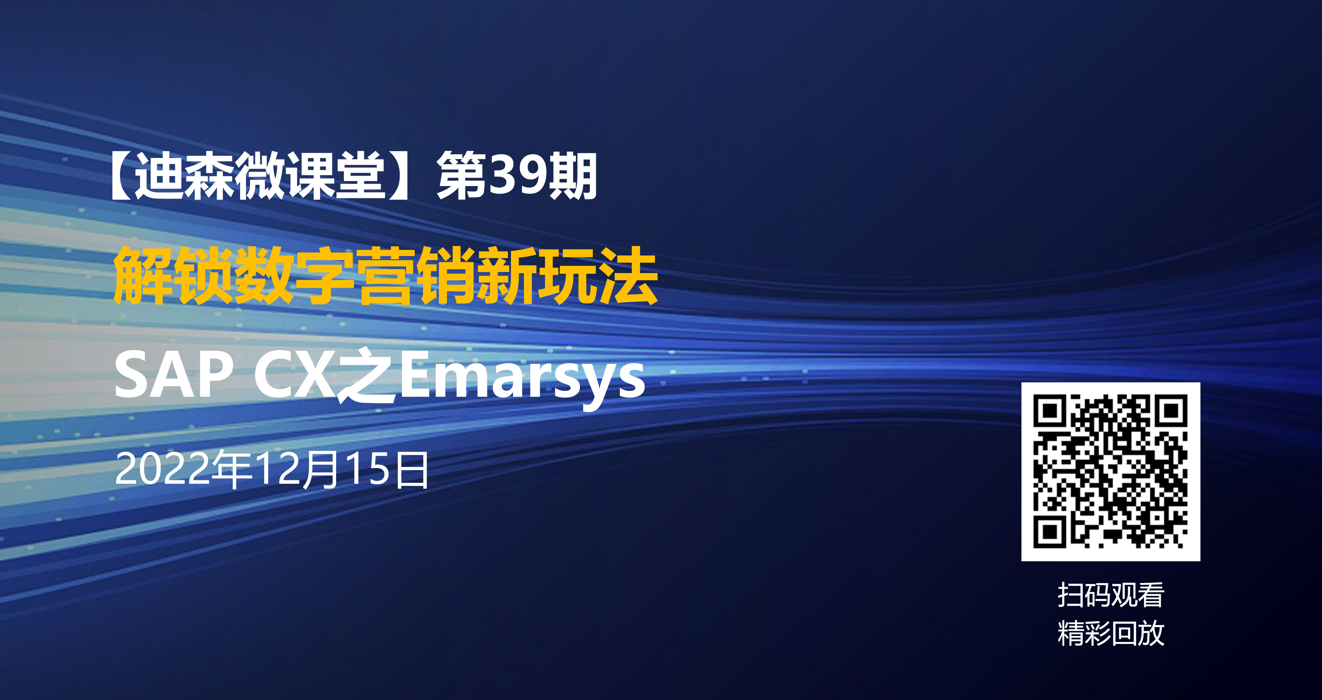 12月15日,【迪森微课堂】第39期由迪森联手SAP专家以直播方式,深入讲解 SAP CX之Emarsys市场营销解决方案,直播人气爆棚,汇聚了来自全球的SAP业界人士。大家纷纷感叹受益匪浅,收获颇丰,不仅感谢老师的精彩分享,也感谢迪森提供这么优质的纯干货分享平台,获得全场好评点赞不断。