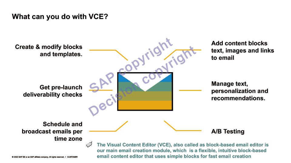 VCE是专门针对email端的可视化内容编辑器,企业可以通过使用VCE 动态模块的方式去构建email,从而做到所见即所得的设计,并且可以加入许多个性化的内容,以及进行A/B测试。同一个email可以设置不同的版本,并针对不同的版本发送到不同的群体或按照不同的比例发送,根据用户最后的统计分析报告来决定,将哪个版本作为主要的营销来使用等。