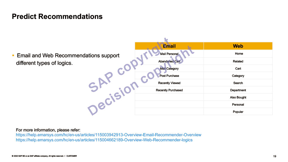 SAP Emarsys自带了一个预测的推荐引擎,针对不同的渠道提供不同的推荐算法。