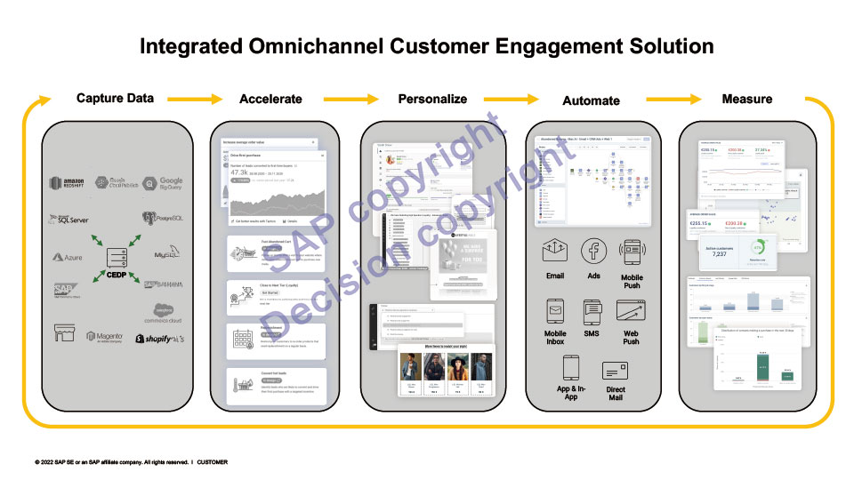 SAP Emarsys是一个完整的、端到端的市场营销解决方案,涵盖从数据收集、市场营销策划、个性化内容设计、程序的调度与管理、数据评估和分析五个层面,形成了一个完整的闭环。通过Emarsys不断的迭代提升,能够使企业的市场营销达到很好的效果。