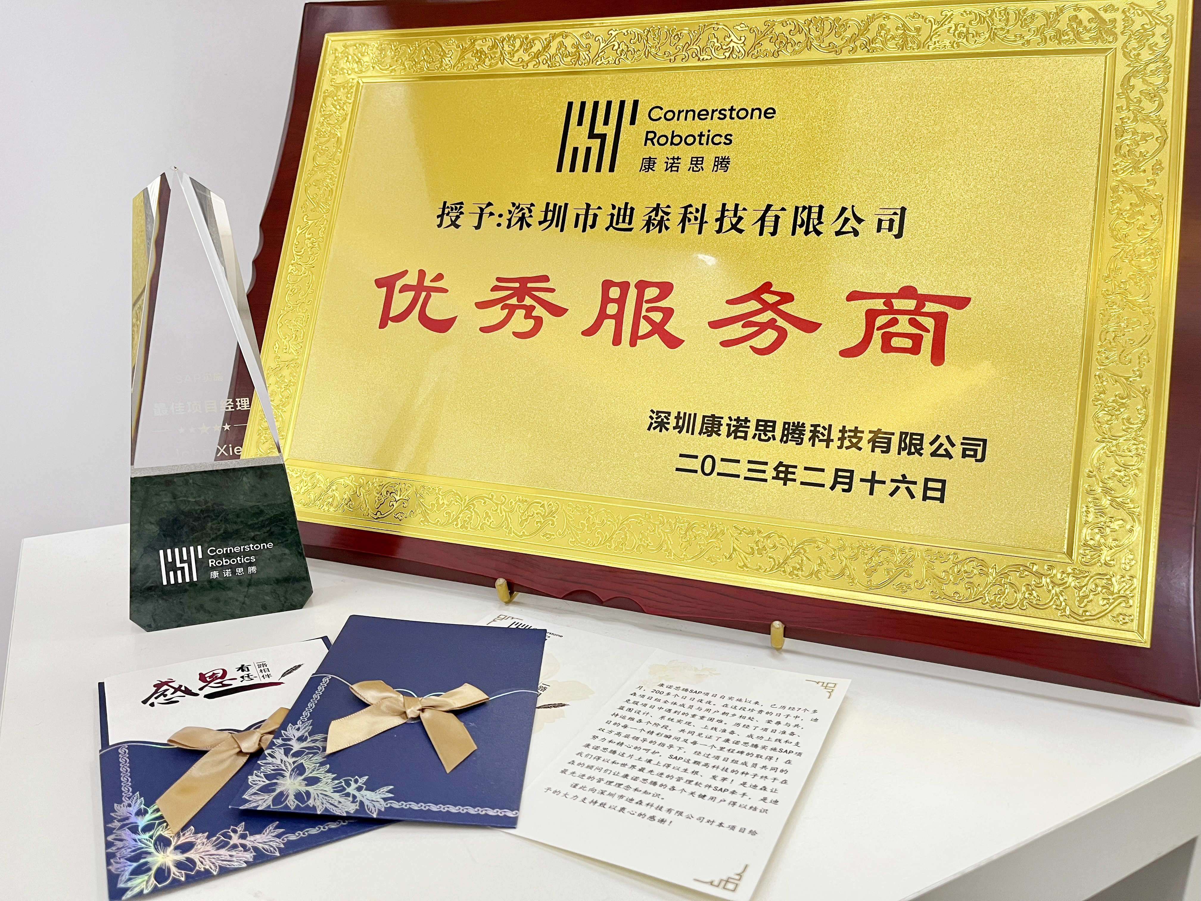 迪森顾问团队凭借专业、高效和务实的杰出表现荣获客户一致赞许与高度认可!为此,康诺思腾特授予迪森「优秀服务商」荣誉称号,并为迪森团队项目经理及每一位顾问都呈上了一封诚意满满的感谢信。