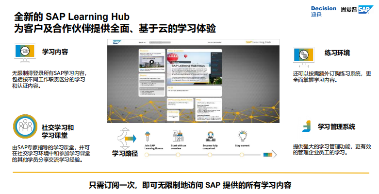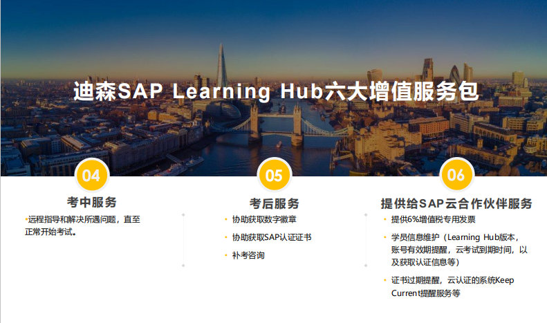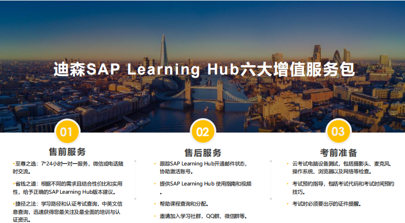 “云”时代下,迪森更是推出SAP Learning Hub六大增值服务包,为各位学员的学习和考证提供全方位服务。