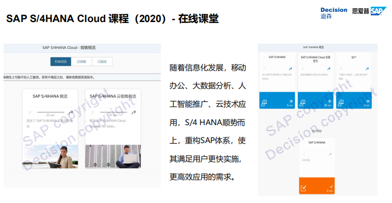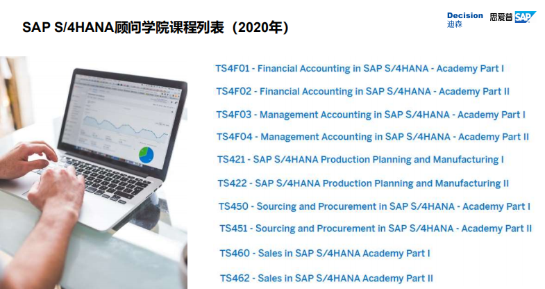 迪森作为SAP大中华区唯一金牌培训合作伙伴、SAP授权培训中心、SAP(中国)教育培训部授权企业互联网顾问学院,将为大家推出一系列S/4HANA和S/4 HANA Cloud 顾问学院课程,以满足不同层次学员的需求,提高大家的学习体验。