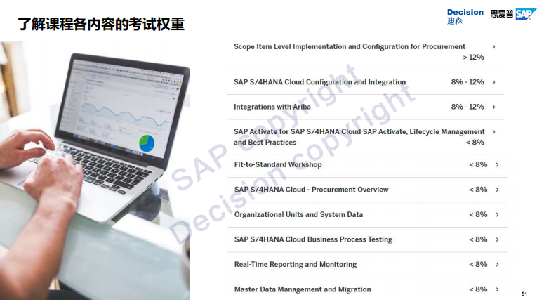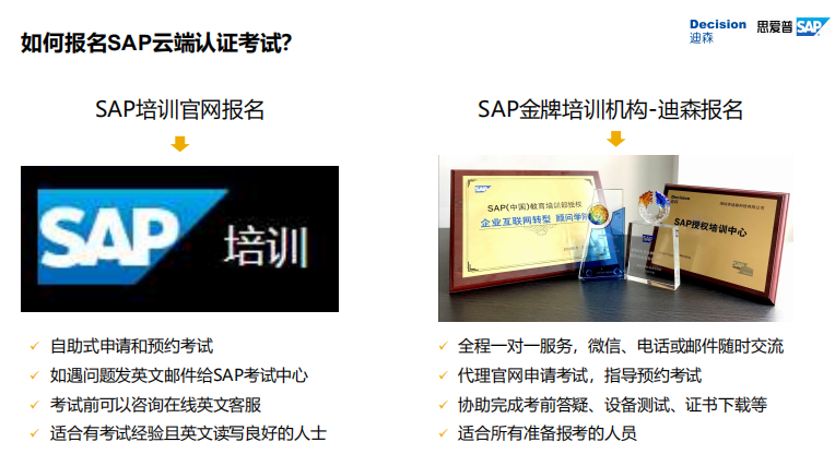 Harrison还从自身经验出发,为学员们梳理了Cloud学习的“雷区”,并讲解了云端认证考试的必要性与报名途径,其中,通过SAP金牌培训机构迪森报名,可以为学员提供全程一对一的服务,代理官网申请考试,指导预约,并协助完成考前答疑、设备测试、证书下载等,适合所有准备报考的人员。