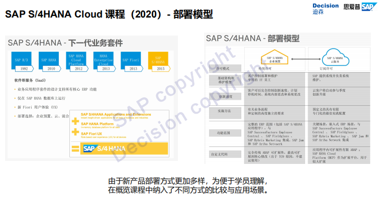 由于新产品部署方式更加多样,为便于学员理解,S/4HANA云版本在概览课程中纳入了不同方式的比较与应用场景。