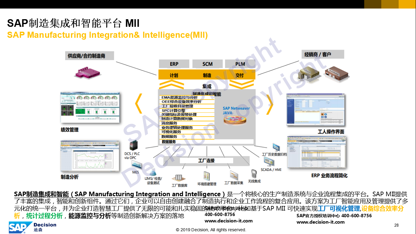 SAP制造集成和智能管理(SAP Manufacturing Integration and Intelligence)是一个将核心的生产制造系统与企业流程集成的平台。SAP MII提供了丰富的集成,智能和创新组件。通过它们,企业可以自由创建融合了制造执行和企业工作流程的复合应用。该方案为工厂智能应用及管理提供了多元化的统一平台,并为企业打造智慧工厂提供了无限的可能和扎实稳固的技术平台,比如基于SAP MII 可快速实现工厂可视化管理,设备综合效率分析,统计过程分析,能源监控与分析等制造创新解决方案的落地。