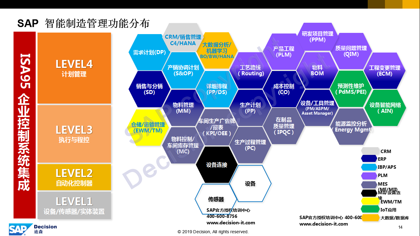 SAP智能制造管理功能的分布,按照ISA95的企业控制系统集成标准来看,SAP目前已经从Level1到Level4四个层面都有对应的解决方案。按照功能来分,MES是深紫色,各个系统的功能连接在一起,包括大数据分析和机器学习、PdMS、ECM等等这些产品,都可以无缝集成在一起,保证我们从Level1到Level4的全面的智能制造的完整的管理布局。