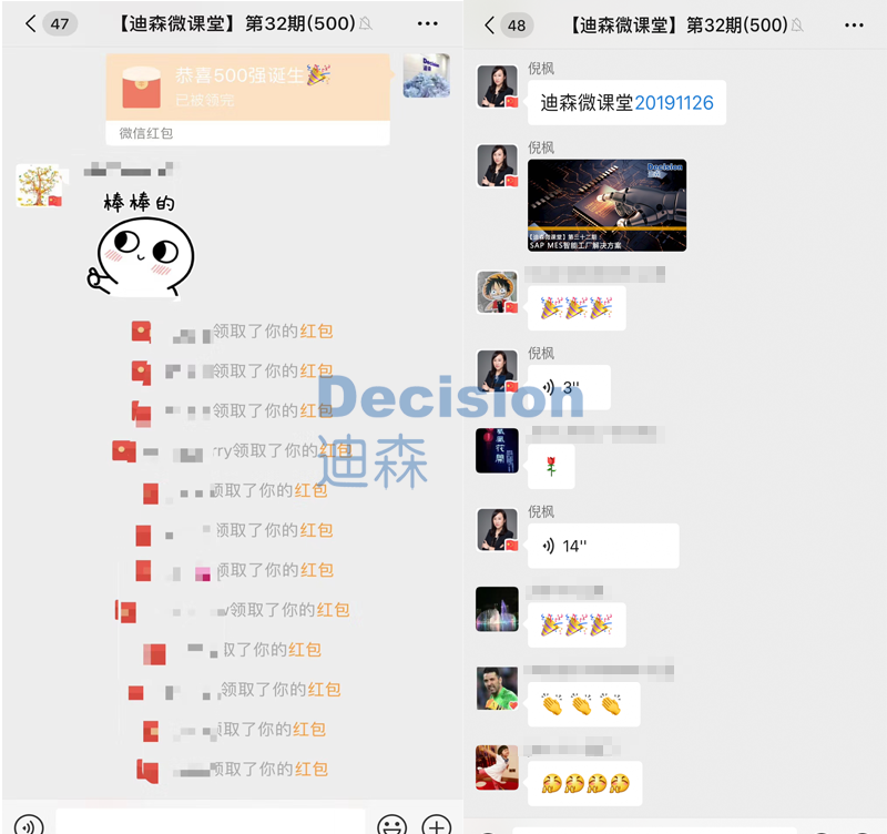 11月26日晚8点,【迪森微课堂】第32期500人同行在线,迪森倪总首先对来自全球海内外,全国各地汇集而来的IT人士致以亲切的问候,特别是有些小伙伴克服时差专门在凌晨听课。并表示【迪森微课堂】创办三年多以来,汇聚了全世界3万多SAP业界人士,每期的微课堂都人气爆棚,因而我们更是坚定初心,SAP的每一次新功能,新产品的发布,都会在第一时间免费通过微课堂分享给大家。尤其是本期抢位成功的500强,将收获最新的SAP MES智能工厂解决方案!