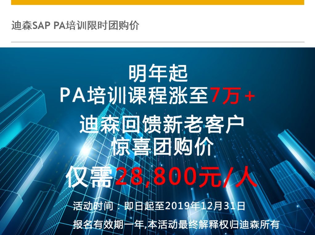 最后,迪森更是为广大学员带来重磅福利,明年PA培训课程大幅涨价,迪森为回馈新老客户,特推出团购价,即日起至2019年12月31日报名,仅需28,800元/人!