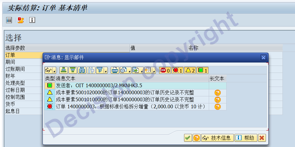生产订单在事务码KO88结算时,系统提示MLCCS015,如下图,这是什么原因?如何处理?