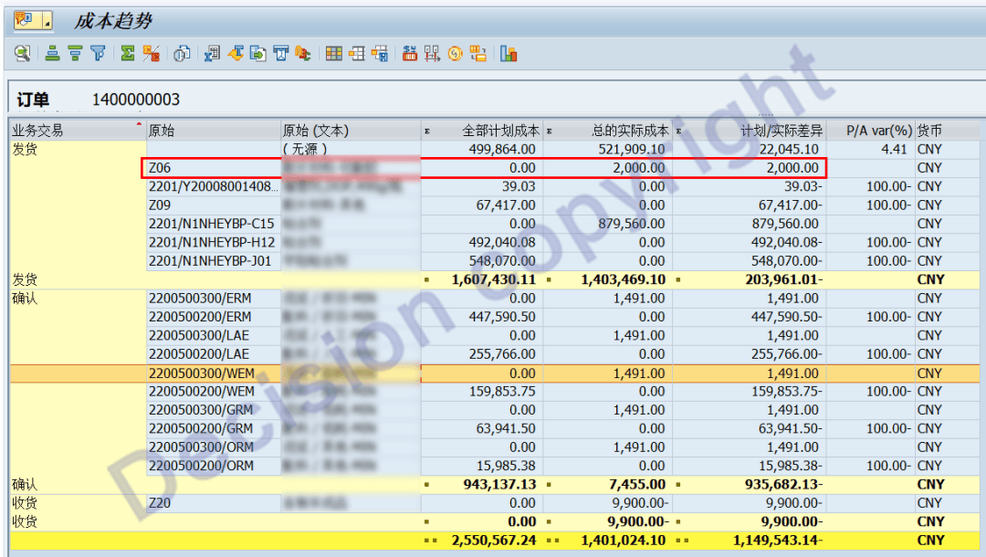 3. 我们可以进一步分析事务码CO03 查看生产订单成本 ,发现上述2000元成本,为下面数据行: