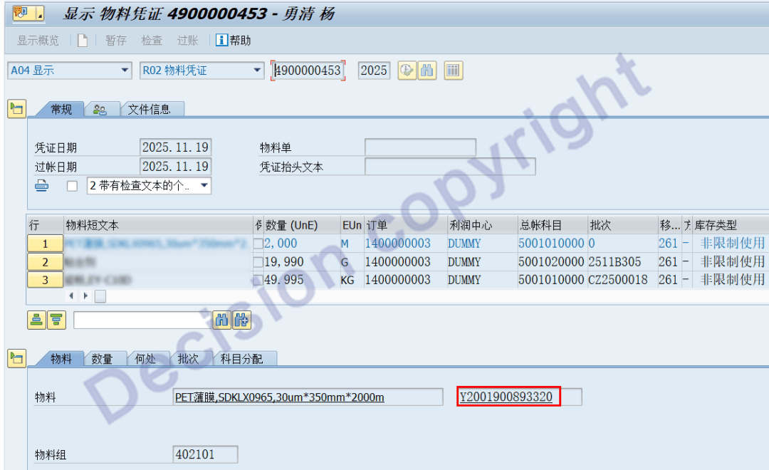 双击2000元这一行数据,追溯到领料凭证,可以看到工厂是 2201,物料 Y2001900893320。