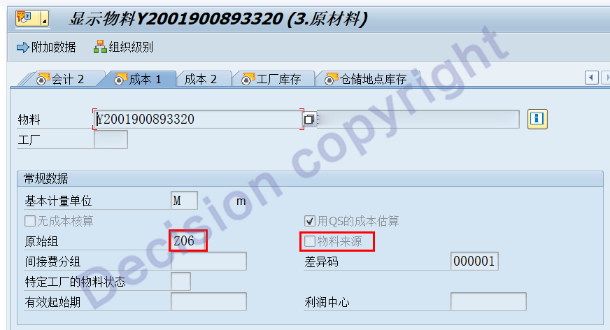 继续双击物料编号,查看 成本视图:原来是 维护了 源始组,但没有勾选:物料来源。
