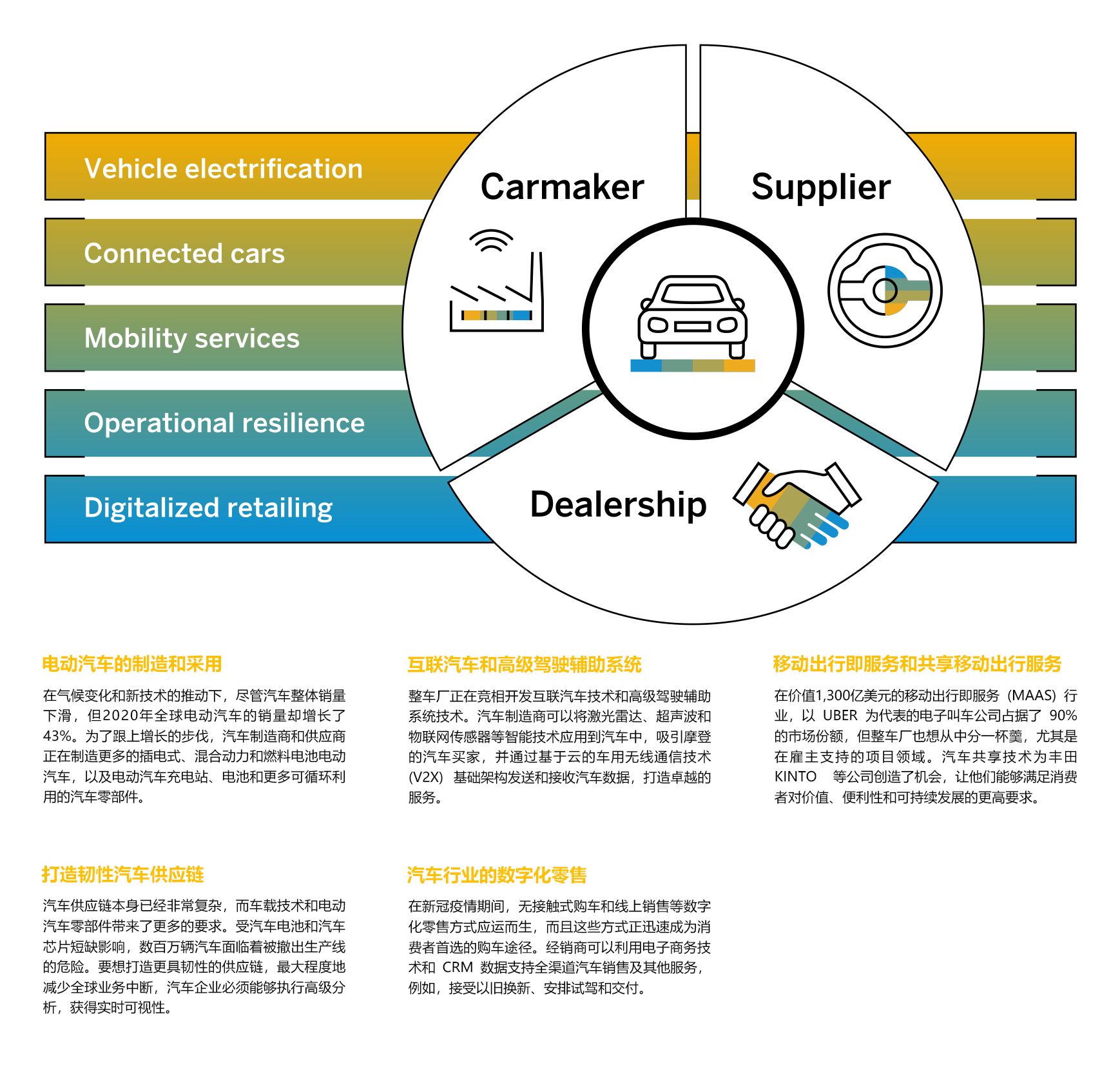 汽车制造商、供应商和经销商如今都面临着巨大的压力,他们需要实施业务转型,准备好迎接移动出行的未来。