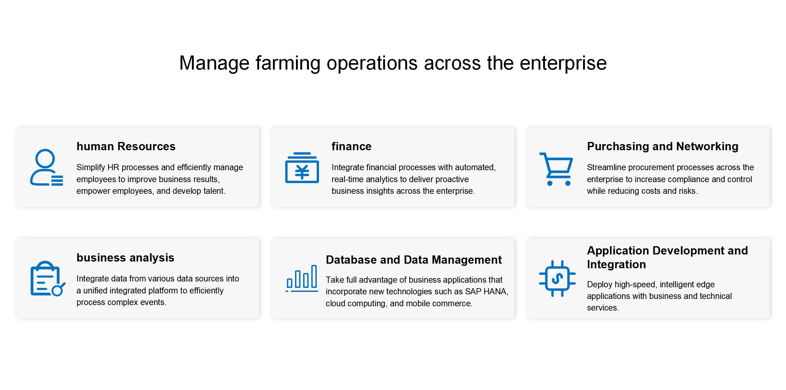 Run core business processes across the entire value chain of your agriculture and livestock business more efficiently with SAP solutions for end-to-end food management from farm to fork.